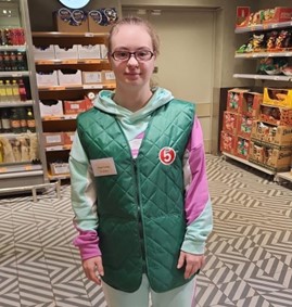 Настя Петрова на работе надевает зелёную жилетку с картинкой магазина Пятёрочка.
